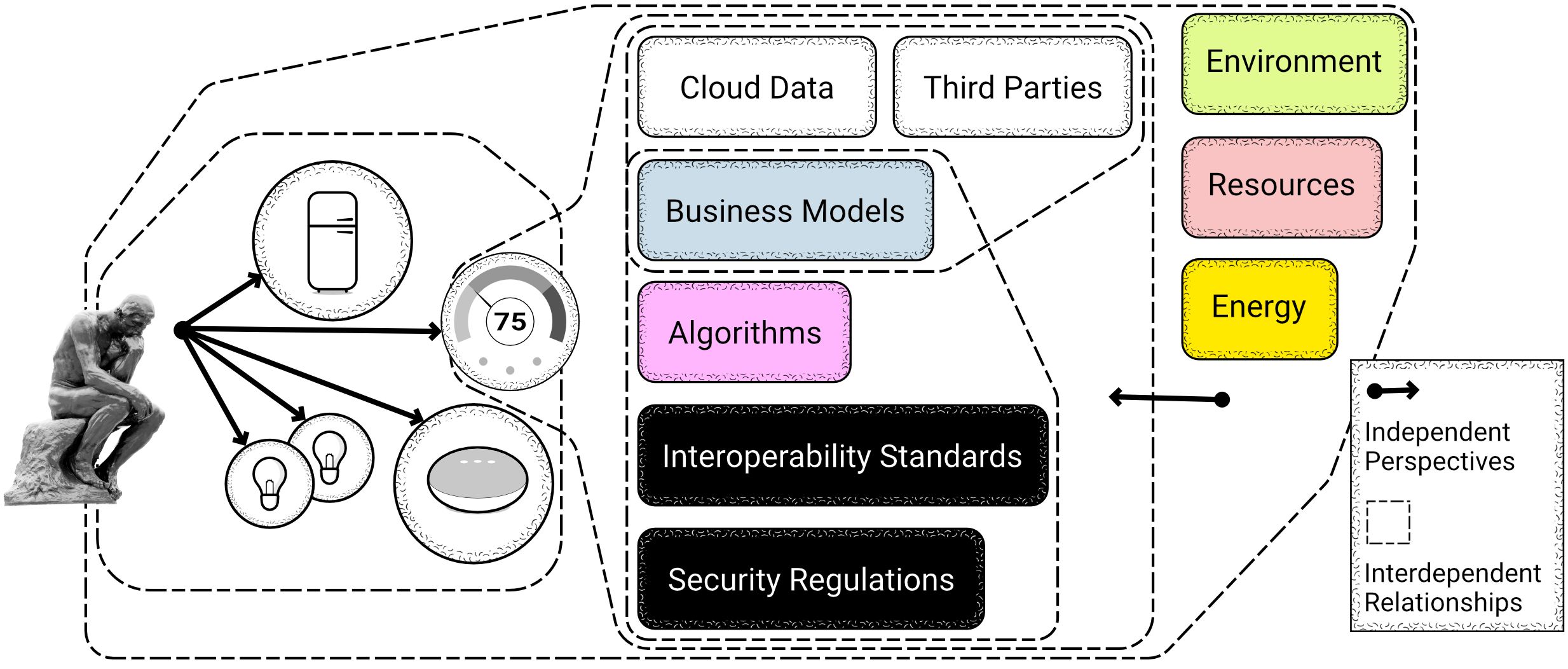 From a design standpoint these interactions and arrangements are imagined from a human perspective, but the interactions occurring here are not with the human in mind. They are with ISP, private companies, or governments in mind. Furthermore, as a user your understanding remains a 1-1 relationship between yourself and the smart object. So how can design take into account this non-human perspective occurring within the Internet?